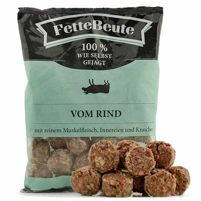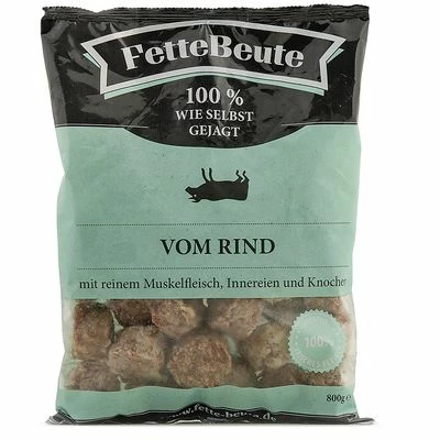 Wo FetteBeute drauf steht, ist auch fette Beute drin: Die FetteBeute-Nuggets mit Rind bieten Ihrem Hund intensiven Fleischgenuss und stellen eine komplette Mahlzeit dar. Das Hundefutter ist frei von Getreide, Gluten, Zucker und jeglichen Zusätzen und eignet sich daher ausgezeichnet für eine natürliche, artgerechte Ernährung Ihres Vierbeiners.
