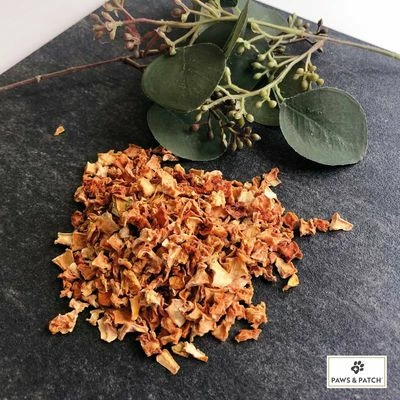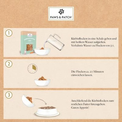 Die zu 100% natürlichen Flocken sind besonders kalorienarm sowie frei von Zuckerzusatz. Für den Erhalt der Aromen und Nährstoffe werden die PAWS & PATCH Kürbisflocken besonders schonend zubereitet. Dafür werden ausschließlich Kürbisse aus europäischer Landwirtschaft verwendet. Einfach kurz in Wasser quellen lassen, zum Futter geben und fertig ist die leckere Gemüsebeilage für Ihren Hund!
