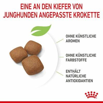 - Komplett-Trockenfutter für junge, heranwachsende Hunde im 8. – 18./24. Lebensmonat