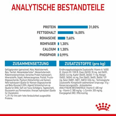 Royal Canin Giant Junior enthält deshalb einen angepassten Proteingehalt, um die Muskelentwicklung im Alter von 8 bis 18/24 Monaten zu unterstützen. Außerdem beinhaltet es Nährstoffe wie Vitamin C und E, die nachweislich die Entwicklung des Immunsystems des Welpen unterstützen können. Übergroße Hunde haben ebenso ein empfindliches Verdauungssystem und können zu Durchfall und Blähungen neigen. Die Kombination aus nützlichen Präbiotika (wie FOS, MOS und Rübenschnitzel) und hochverdaulichen Proteinen unterstützt dabei das Gleichgewicht der Darmmikrobiota, um die Verdauung bestmöglich zu fördern.