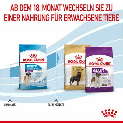 Welpen sehr großer Rassen benötigen in etwa 18-24 Monate, um ihr Erwachsenengewicht von 45+ kg zu erreichen. Während dieser Zeit ändern sich ihre Ernährungsbedürfnisse, weshalb Royal Canin zwei Futtersorten entwickelt hat: Royal Canin Giant Puppy, das zwischen 2 und 8 Monaten gefüttert wird, und diese Formulierung – Royal Canin Giant Junior – für den Zeitraum von 8 bis 18/24 Monaten.