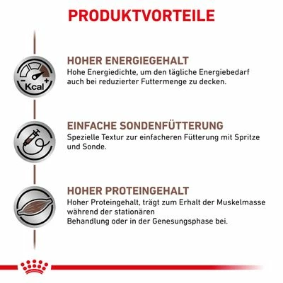 Royal Canin Veterinary Canine Recovery zeichnet sich durch eine leicht verdauliche, gut bekömmliche Zusammensetzung aus. Das Diätfutter ist reich an Proteinen, die wichtig für den Erhalt der Muskeln sind. Die extra weiche Mousse-Konsistenz ermöglicht verschiedene Fütterungsoptionen: einfach im Napf, per Sonde oder peroral mit einer Spritze. Das Diät-Nassfutter punktet mit einem besonders leckeren Geschmack und wird daher auch von vielen Vierbeinern mit weniger Appetit gut angenommen. Royal Canin Veterinary Canine Recovery Mousse im Überblick:
