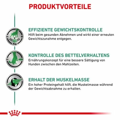 Das Diät-Hundefutter von Royal Canin hat einen hohen Proteingehalt, was zum Erhalt der Muskelmasse während der Diät beiträgt. In Kombination mit dem hohen Gehalt an Fasern ergibt sich darüber hinaus eine sehr sättigende Rezeptur, die dabei helfen kann, das Bettelverhalten Ihres Hundes zu kontrollieren und spontanes Fressen zwischen den Mahlzeiten zu vermeiden.
