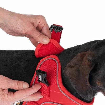 Hörst du den Ruf des Abenteuers? Wenn du und dein kleiner Hund dafür noch das passende Geschirr benötigen, dann machst du mit dem TIAKI Geschirr Wave Vest, rot den richtigen Griff: Das luftdurchlässige Mesh-Material passt sich durch seine weiche Beschaffenheit an den Körper deines Hundes an und bietet dank seiner atmungsaktiven Eigenschaften auch an heißen Tagen ein gutes Tragegefühl. Das Anziehen des Hunde-Accessoires geht schnell und ist kinderleicht, denn dein Hund muss nur mit den Vorderpfoten einsteigen, du schließt den Klick- und Klettverschluss, und schon fertig!