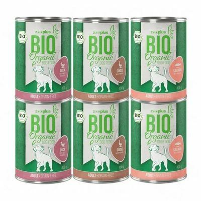 Zooplus Bio feinste Hundenahrungt: Bio-Lachs, Bio-Ente und Bio-Gans von artgerechter Tierhaltung, Obst & Gemüse aus kontrolliert biologischem Anbau. Alle getreidefreien Sorten im Mixpaket ausprobieren